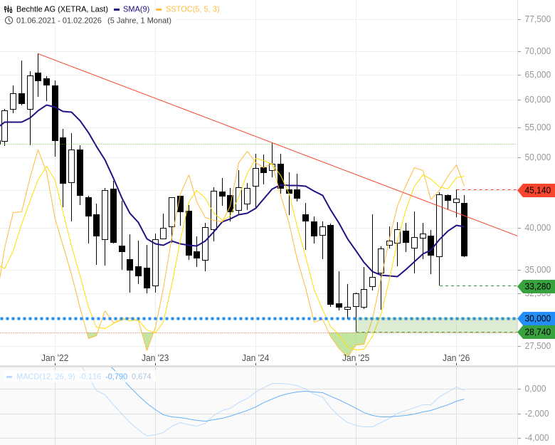 Auf der Unterseite rückt bei anhaltender Schwäche der Unterstützungsbereich um 33,28 EUR in den Fokus. Dort könnte es zumindest zu einer technischen Reaktion kommen. Für einen echten Stimmungswechsel müsste die Aktie jedoch dynamisch über die 40 EUR zurückkehren und sich darüber festsetzen. Erst dann würde sich das Chartbild spürbar aufhellen und auch für kurzfristige Long Setups interessanter werden.