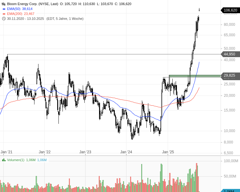 Kurz vor meinem Urlaub schrieb ich über Bloom Energy: "Ist Bloom Energy ein Hidden Champion der KI-Rechenzentren-Stromversorgung? Naja, "hidden" ist er jedenfalls für stock3-Leser nicht mehr und nach dem jüngsten Kursverlauf ist der Chart massiv überkauft, Oracle hin oder her. Ein Fahnenmast, wie er im Buche steht. Grundsätzlich gehe ich davon aus, dass die Story langfristig weiter gespielt werden wird, es wird aber für Trader unter Chance-Risiko-Aspekten deutlich bessere Einstiegsmöglichkeiten geben als in den aktuellen Hype hinein. Auch die Bloom-Energy-Aktie wird wieder konsolidieren. Geduld!"