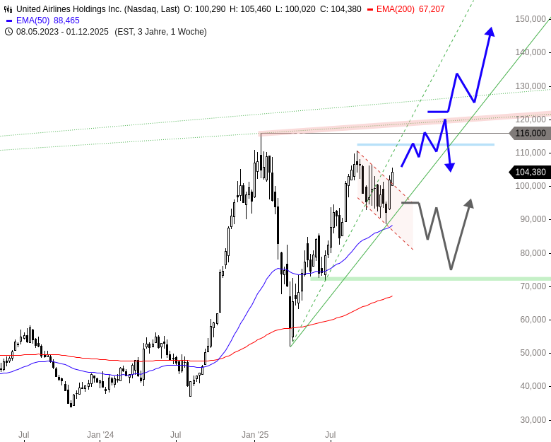 Oberhalb von 119 USD würde die Rally Zugewinne bis 125 und 133 USD ermöglichen. Darüber könnte der übergeordnete Aufwärtstrend der letzten Jahre die Aktie der Fluggesellschaft sogar an den Bereich um 148 USD führen.