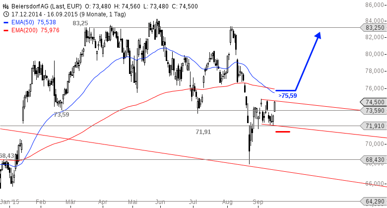Gelingt der Aktie von Beiersdorf ein Ausbruch über 75,59 Euro, dann besteht eine gute Chance auf einen weiteren Anstieg in Richtung 83,25 Euro. Sollte der Wert allerdings unter 71,91 Euro abfallen, könnte es zu einem erneuten Rückfall gen 67,92 Euro kommen.