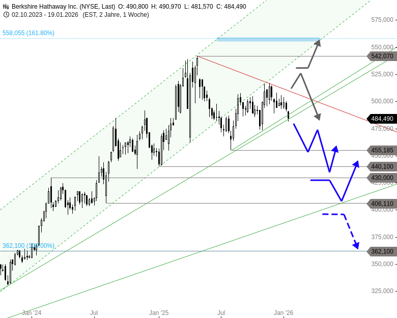 Bricht die Berkshire-Hathaway-Aktie dagegen auch unter 430 USD ein, stünde die Ausweitung des Korrektur-Moves an das breite Unterstützungscluster zwischen 395 und 406 USD an. Damit wäre die längerfristige, bis 2020 zurückreichende Aufwärtstrendlinie erreicht. Deren Bruch dürfte eine massive Verkaufswelle bis zum früheren Rekordhoch bei 362,10 USD auslösen.