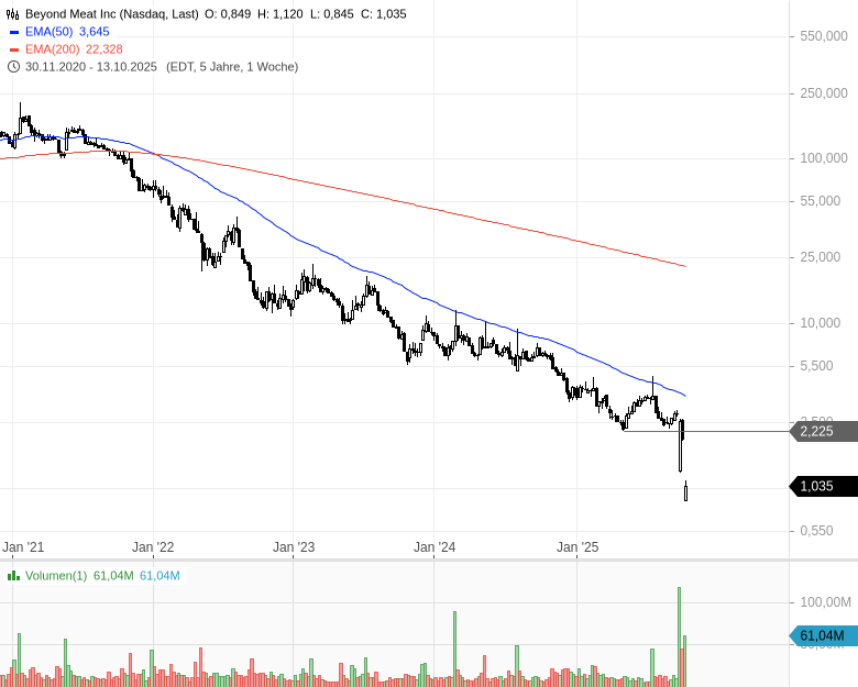 Die massive Verwässerung führt heute zu einem weiteren Kurssturz der Aktie. Zwischenzeitlich notierte der Zockertitel schon weit im Pennystockbereich, kämpft aktuell um die 1-USD-Marke. Den nächsten Quartalsbericht wird Beyond Meat am 4. November vorlegen.