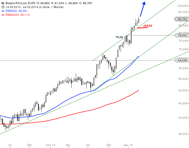 In den letzten Wochen und Monaten legte die Aktie von Biotest deutlich zu. Auslöser für diese Rally war der Ausbruch über das alte Allzeithoch bei 64,00 Euro aus dem November 2011. Zunächst kletterte die Aktie auf 78,50 Euro. Nach einer kleinen Konsolidierung durchbrach die Aktie auch dieses hoch und sogar eine obere Pullbacklinie. Diese liegt aktuell bei 84,48 Euro. In den letzten Wochen bewegte sich der Wert oberhalb dieser Trendlinie nach oben, ohne sich aber deutlich nach oben absetzen zu können.