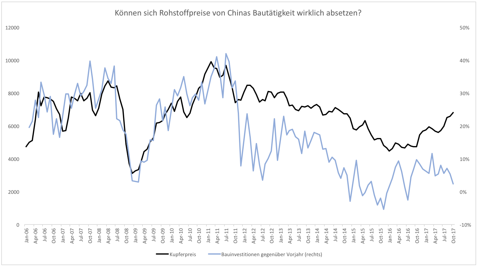 Seit 2006 gingen Rohstoffpreise und Investitionstätigkeit in China Hand in Hand. Seit April 2017 ist das nicht mehr der Fall. Es ist inzwischen eine ziemlich große Divergenz entstanden. Da es keinen Verbraucher auf der Welt gibt, der Chinas sinkende Nachfrage auffangen kann, sollte man die Divergenz ernst nehmen. Der Disconnect wird sich 2018 höchstwahrscheinlich nach unten auflösen. Anleger sollten das in ihrer Planung berücksichtigen.