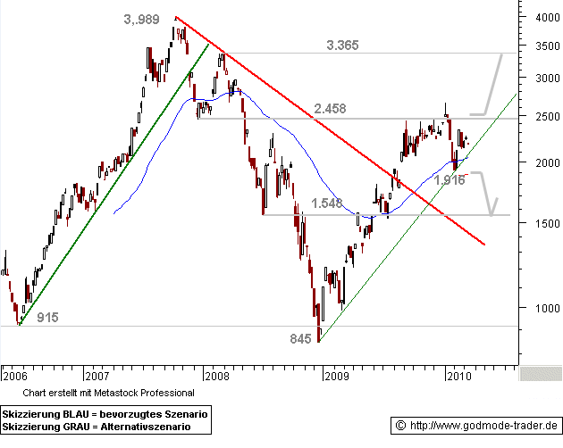 Kurzfristig heißt es abwarten, ob nach dem Fehlausbruch nach oben eine weitere Aufwärtsbewegung möglich wird. Eine deutliche Aufwärtsbewegung bis ca. 3.400 $ wäre erst bei einem Ausbruch über die 2.459 $-Marke zu erwarten. Fällt Blei nachhaltig unter 1.916 $ zurück, wird eine Abwärtskorrektur bis zur 1.548 $-Marke möglich.
