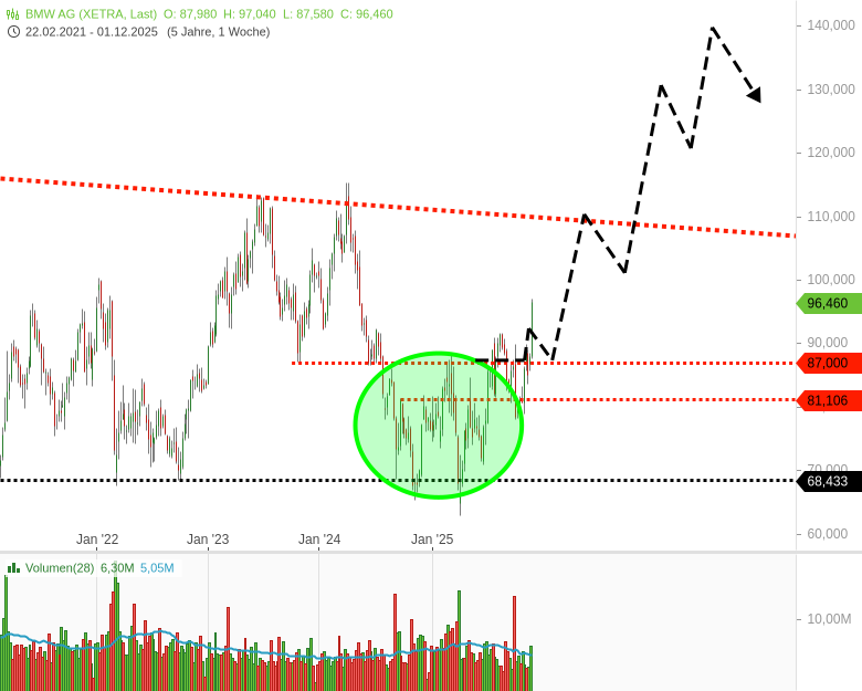 BMW - Mittelfristige Prognoseskizze als Grafiksnapshot - Chartanalyse & Trading - 1 Kerze = 1 Woche