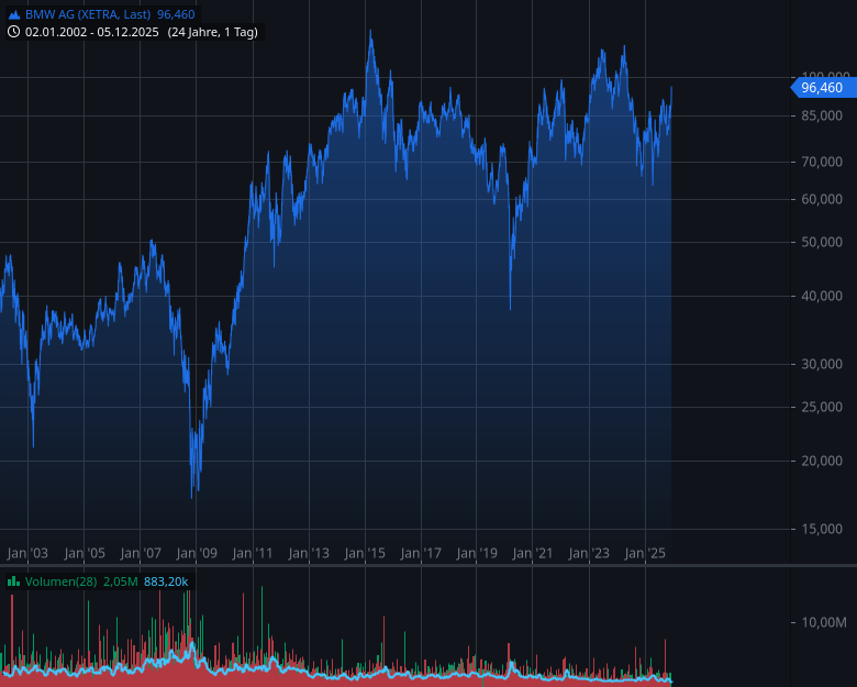 Quartalszahlen: BMW verzeichnete ein Umsatzminus von rund 8% auf 33,9 Mrd. Euro und einen Ergebnisrückgang vor Steuern um 32% auf 2,6 Mrd. Euro. Trotz dieser Belastungen bestätigt der Konzern seine Jahresziele mit einem anvisierten EBIT von 5-7% und verteidigt damit seine robuste Position. Hauptproblem ist die nachlassende Nachfrage in China sowie der Druck durch US-Zölle. Dennoch hält BMW an seiner Strategie der "Neuen Klasse" fest, die ab September 2025 für neue Produkte und Innovationsschub sorgen soll. Dieser Technologiewechsel erhöht die langfristigen Wachstumschancen. Die Dividendenrendite liegt bei rund 4,5%, was für einen Autohersteller attraktiv ist. Das KGV bewegt sich mit ca. 8-9 auf einem moderaten Niveau.