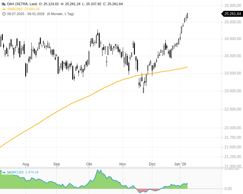 In der vergangenen Woche erreichten die Aktienmärkte in Deutschland und den USA erneut historische Höchststände. In Deutschland kletterte der DAX erstmals über die Marke von 25.000 Punkten. Dabei wurde der deutsche Leitindex vor allem von der Rheinmetall-Aktie nach oben gezogen, die auf Wochensicht um fast 19 % zulegen konnte, nachdem der US-Militäreinsatz in Venezuela den Rüstungssektor erneut befeuerte.