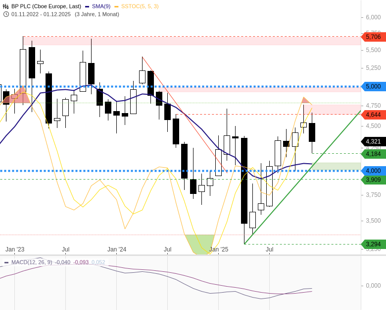 Charttechnisch präsentiert sich das Bild neutral bis leicht positiv. Bereits seit August notiert die BP-Aktie oberhalb ihrer 200-Tage-Linie. Diese verläuft aktuell bei 4,09 GBP und stabilisiert den Bereich um 4 GBP als wichtige Unterstützung. Solange diese Zone hält, bleibt der übergeordnete Aufwärtstrend intakt. Auf der Oberseite rückt ein erstes Kursziel im Bereich von 4,60 bis 4,70 GBP in den Fokus.