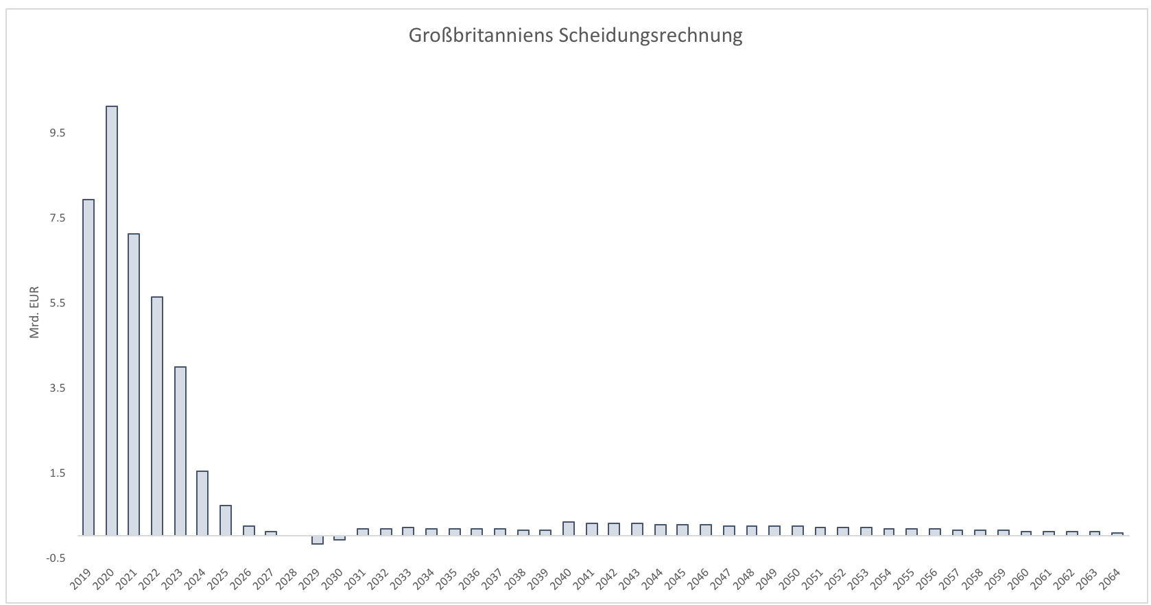 Die Scheidungsrechnung ist aus mehreren Gründen bemerkenswert. Einerseits sind die Kosten hoch, andererseits ziehen sich die Zahlungen über Jahrzehnte hin. Der EU-Austritt mag zwar bald stattfinden, doch frei von finanziellen Verpflichtungen ist Großbritannien noch lange nicht.