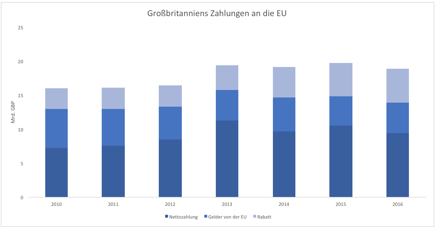 Großbritannien erhielt im Gegensatz zu anderen Ländern einen Rabatt auf die Zahlungen. Dieser lag 2016 bei 5 Mrd. Pfund. So wurden immer noch 13,8 Mrd. Pfund überwiesen, doch im Gegenzug erhielt Großbritannien auch Gelder. Diese beliefen sich in Summe auf 4,4 Mrd. Pfund. Netto zahlte Großbritannien zuletzt also 9,4 Mrd. Pfund ein.