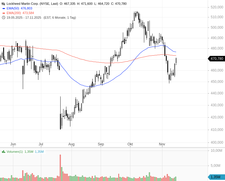 - Lockheed Martin Corp.Kursstand: 470,780 $ (NYSE) - Zum Zeitpunkt der VeröffentlichungVerkaufenKaufen