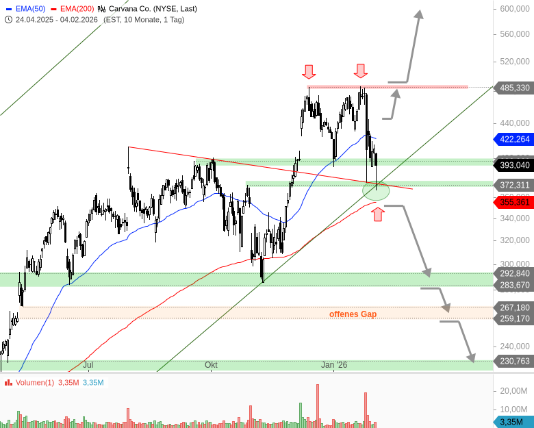 Fazit: Die übergeordnet sehr starke Carvana-Aktie hat gestern an einem wichtigen Unterstützungskreuz gedreht. Bleiben die Käufer am Ball, wäre von hier aus tatsächlich ein Rallystart denkbar. Bei weiterer Schwäche hingegen ist große Vorsicht geboten, das Unterstützungskreuz und der EMA200 sollten nicht unterschritten werden. In diesem Fall könnte eine Stop-Loss-Welle folgen.