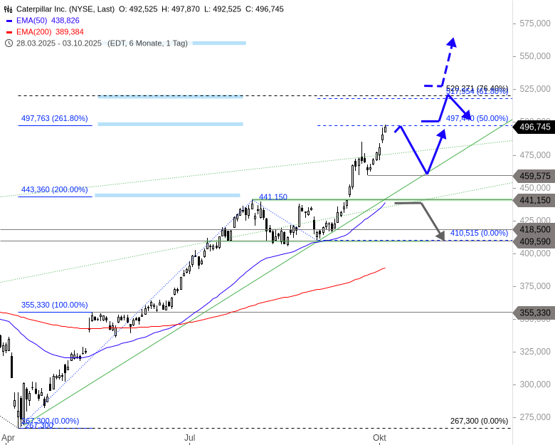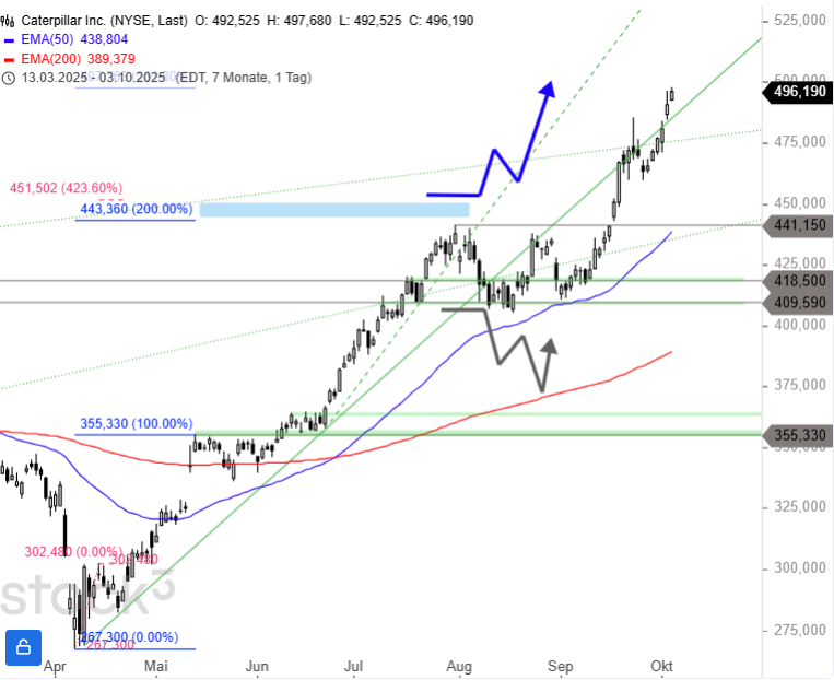 Sollte die Caterpillar-Aktie jetzt am Gebiet um 498 USD nach Süden abdrehen, ist ein Rücksetzer unter 475 USD das erste prozyklische Zeichen für den Start einer Korrektur. Allerdings könnte diese Gegenbewegung analog zur kurzen Korrekturphase im August bereits am Zwischentief bei 459,57 USD gestoppt werden und dort in den nächsten Aufwärtsimpuls münden.