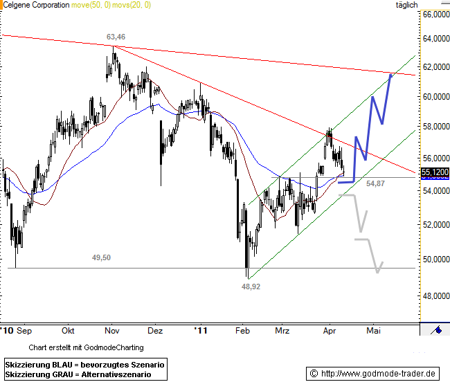 Rückblick: Die Aktien von Celgene konnten sich im Februar und März ordentlich entwickeln und ausgehend vom Tief bei 48,92 $ bis auf 57,95 $ klettern. Dabei bildete sich ein kurzfristiger Aufwärtstrend, der im Bereich von 57,95 $ jedoch auf ein stärkeres Widerstandscluster traf. In diesem Bereich befand sich zum einen die mittelfristige Abwärtstrendlinie und zum anderen die obere Begrenzung des laufenden Aufwärtstrends.