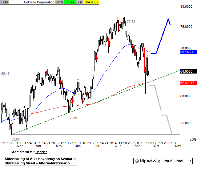 Rückblick: Die Aktien von Celgene befinden sich aktuell in einer Phase, in der sich entscheiden muss, ob die aktuell laufende Abwärtsbewegung in einen ausgewachsenen Abwärtstrend übergeht oder ob sich diese letztlich als Korrektur im übergeordneten Aufwärtstrend einstufen lässt. Technisch ist zur Zeit beides möglich, denn mit Kursnotierungen um ~62,80 $ befindet sich ein mittelfristiger Wegweiser.