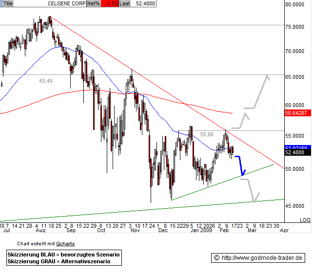 Charttechnischer Ausblick: Nachdem die Aktie von Celgene bei 55,80 $ scheiterte, dürften nun kurzfristig die Verkäufer wieder das Sagen haben. Kursverluste bis auf 49,05 $ wären hier zunächst zu erwarten. Kann diese Unterstützung dann nicht gehalten werden, drohen weitere Verkäufe bis auf 45,50 $.