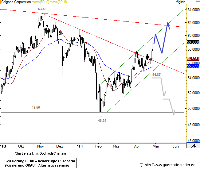 Rückblick: Deutliche Kursgewinne konnte die Celgene Aktie in den letzten beiden Handelstagen verzeichnen, womit diese die Aufwärtsbewegung weiter fortsetzen konnte. Dabei bewegt sich die Aktie nun schon seit Ende Januar in einem kurzfristigen Aufwärtstrend, der nun auch mit dem Bruch der vorangegangenen Abwärtstrendlinie weiter untermauert wurde. Parallel dazu erreichen die Kurse langsam aber sicher auch die obere Trendkanalbegrenzung, die zuletzt deutlich von den Marktteilnehmern wahrgenommen wurde. Diese stellt sich den Bullen als kurzfristiger Widerstand entgegen, gefolgt vom Kursbereich um 61,57 $.
