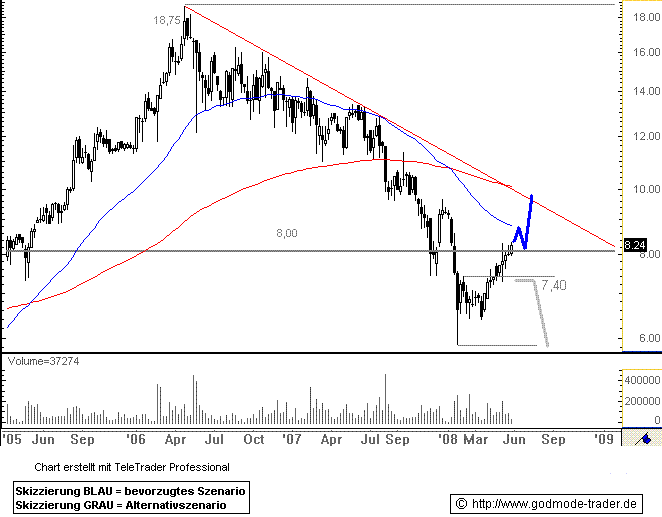 Seit diesem Hoch befindet sich der Wert in einer intakten Abwärtsbewegung. Im Tief fiel er dabei auf 5,86 Euro zurück. Dieses Tief markierte er im Januar 2008. Es war Ausgangspunkt einer Erholung, die noch immer anhält.
