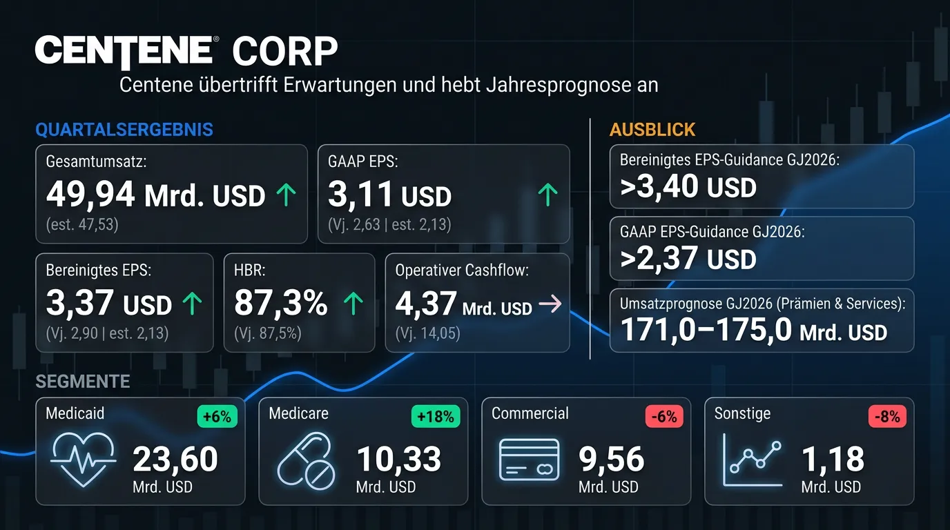 Der US-Krankenversicherer Centene Corporation hat im ersten Quartal 2026 besser abgeschnitten als von Analysten erwartet. Der Gesamtumsatz stieg auf 49,94 Mrd. USD, während das bereinigte EPS von 3,37 USD die Konsensschätzung von 2,13 USD deutlich übertraf – rund 0,50 USD über den eigenen Erwartungen des Unternehmens. Die Gesundheitskosten-Quote (HBR) verbesserte sich leicht auf 87,3% gegenüber 87,5% im Vorjahresquartal, getragen von Fortschritten im Medicaid-Segment und starker Entwicklung im Medicare-Bereich. Centene erzielte zudem einen operativen Cashflow von 4,4 Mrd. USD und reduzierte die Verschuldung im Quartal um 1,0 Mrd. USD. Angesichts der starken Quartalsergebnisse erhöhte das Unternehmen seine Jahresprognose für das bereinigte EPS auf über 3,40 USD und hob die Umsatzguidance um 1,0 Mrd. USD an.