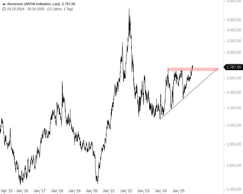 - AluminiumKursstand: 2.777,18 $/t (ARIVA Indikation) - Zum Zeitpunkt der Veröffentlichung