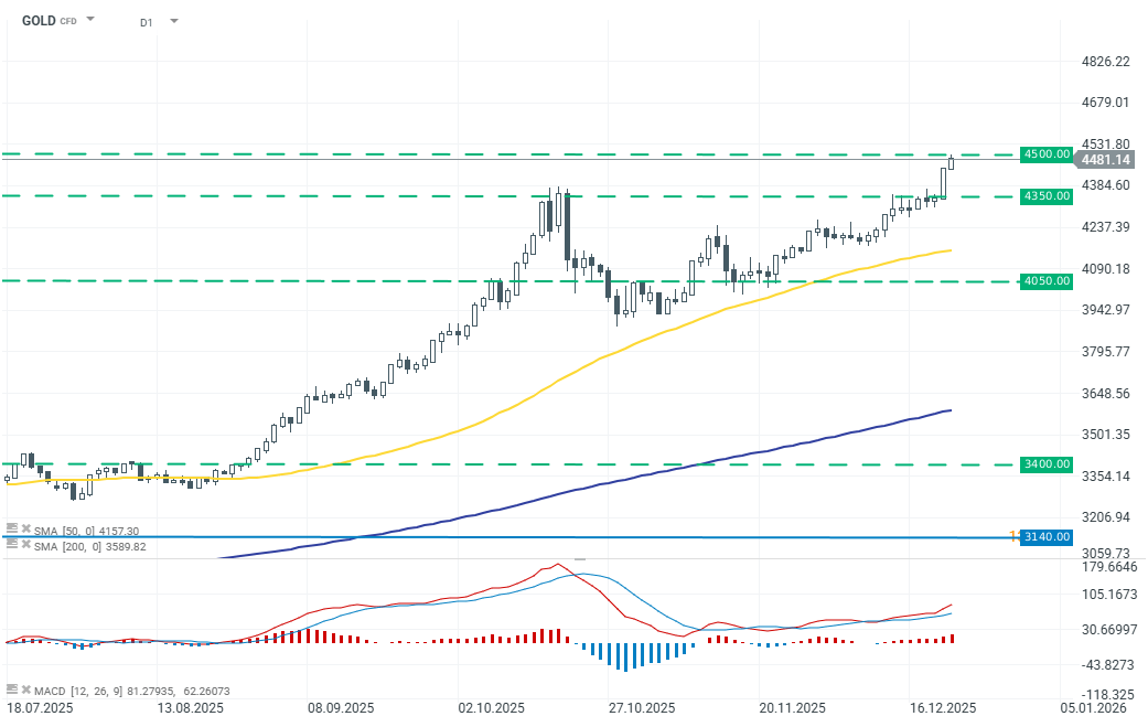 Der Goldpreis setzt seine dynamische Aufwärtsbewegung fort und verzeichnete zuletzt einen Anstieg von 0,82 %. Kurzzeitig näherte sich der Goldkurs einem weiteren wichtigen Meilenstein bei 4.500 USD je Unze und erreichte ein Tageshoch von 4.495 USD. Damit bleibt Gold klar im Fokus der Anleger und bestätigt seine Rolle als bevorzugter sicherer Hafen.