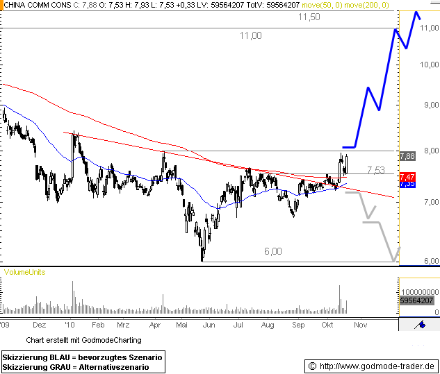 Rückblick: Die China Communications Construction Aktie befindet sich seit dem Hoch bei 11,50 $ im Juni 2009 in einer moderaten Abwärtsbewegung. Dabei wurde ein Tief bei 6,00 $ im Mai markiert und eine Erholung gestartet.