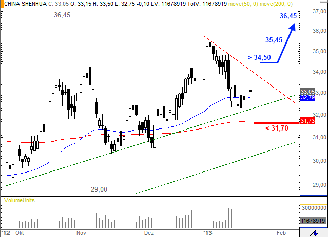 Im Anschluss an das jüngste Verlaufshoch bei 35,45 $ befindet sich die China Shenhua Aktie in einer Konsolidierungsphase. Diese könnte nunmehr am gleitenden Durchschnitt EMA50 (blaue Linie) sowie der knapp darunter verlaufenden Aufwärtstrendlinie seit September 2012 ihr Ende gefunden haben. Ein Ausbruch über 34,50 Euro sollte jedoch abgewartet werden, um sich nicht der Gefahr eines weiteren Rückgangs auszusetzen. Über 34,50 $ wären die Chancen für eine Attacke bis 35,45 und darüber bis 36,45 $ wesentlich höher.