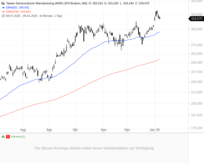 - Taiwan Semiconductor Manufacturing (ADR)Kursstand: 318,010 $ (NYSE) - Zum Zeitpunkt der VeröffentlichungVerkaufenKaufen