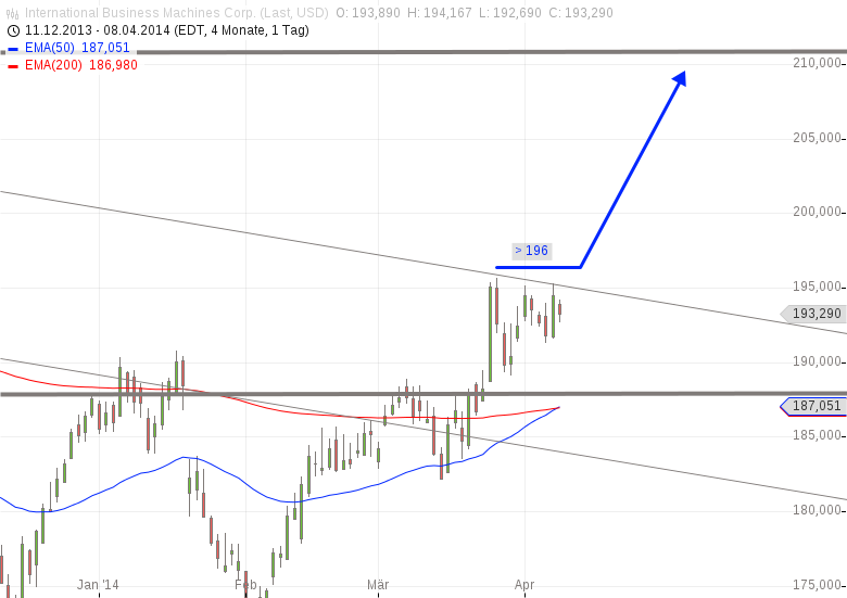 IBM konnte bereits einen Widerstand bei 188 $ knacken, bildet seit einigen Handelstagen zudem unterhalb einer Abwärtstrendlinie ein steigendes Dreieck aus. Steigt IBM über 196 $, generiert dies sofort ein Kaufsignal bis 210 $.