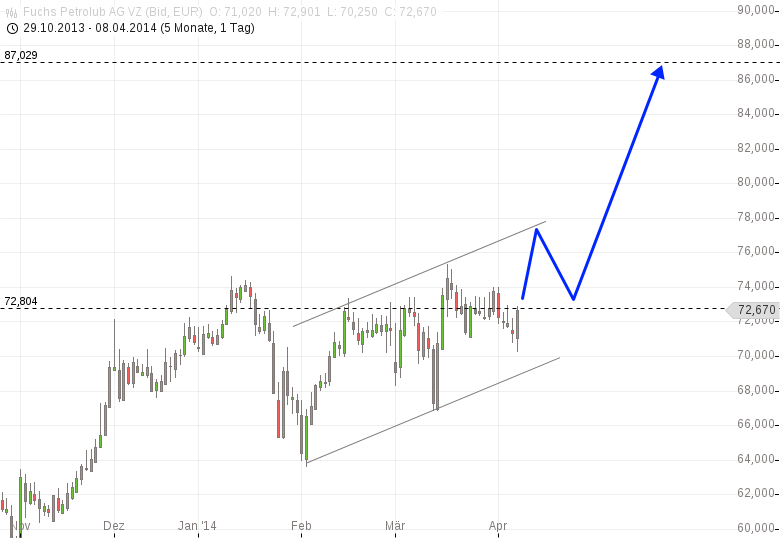 Fuchs Petrolub aus dem MDAX mit mehreren V-Mustern seit Beginn dieses Jahres im Bereich einer Zielmarke von 72,8 €. Mittelfristig ist ein Anstieg bis 87 € wahrscheinlich.