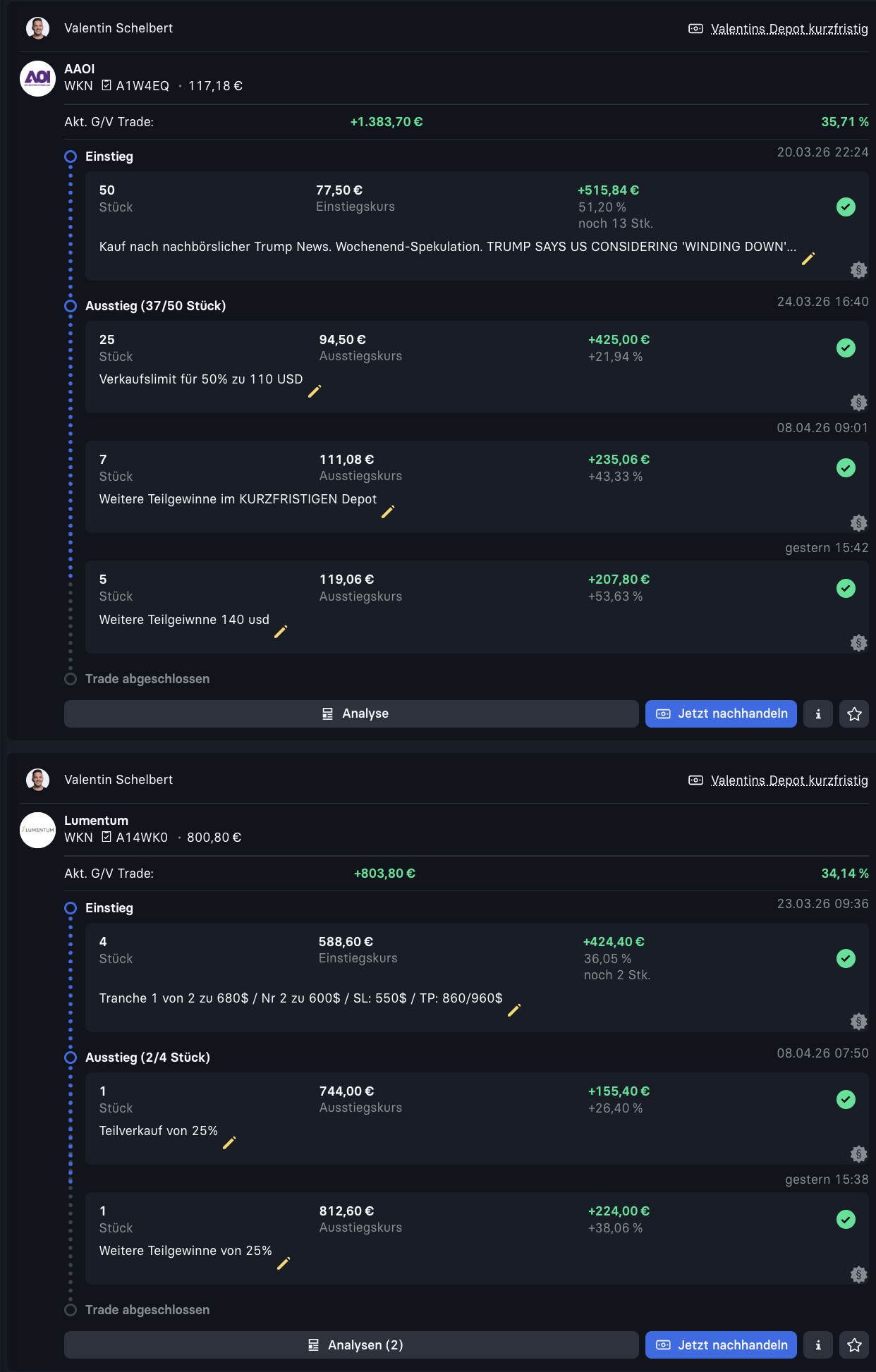 Zusätzlich führt das Update eine neue Empfehlungsliste ein. Setups, die noch nicht im Depot liegen, werden nun zentral an einem Ort gesammelt. Auch die Analysen werden neu gegliedert. Unter „Beiträge“ gibt es ab sofort getrennte Reiter für Chartanalysen und Fundamentalanalysen. Die ersten Trades im neuen Depot wurden bereits getätigt.