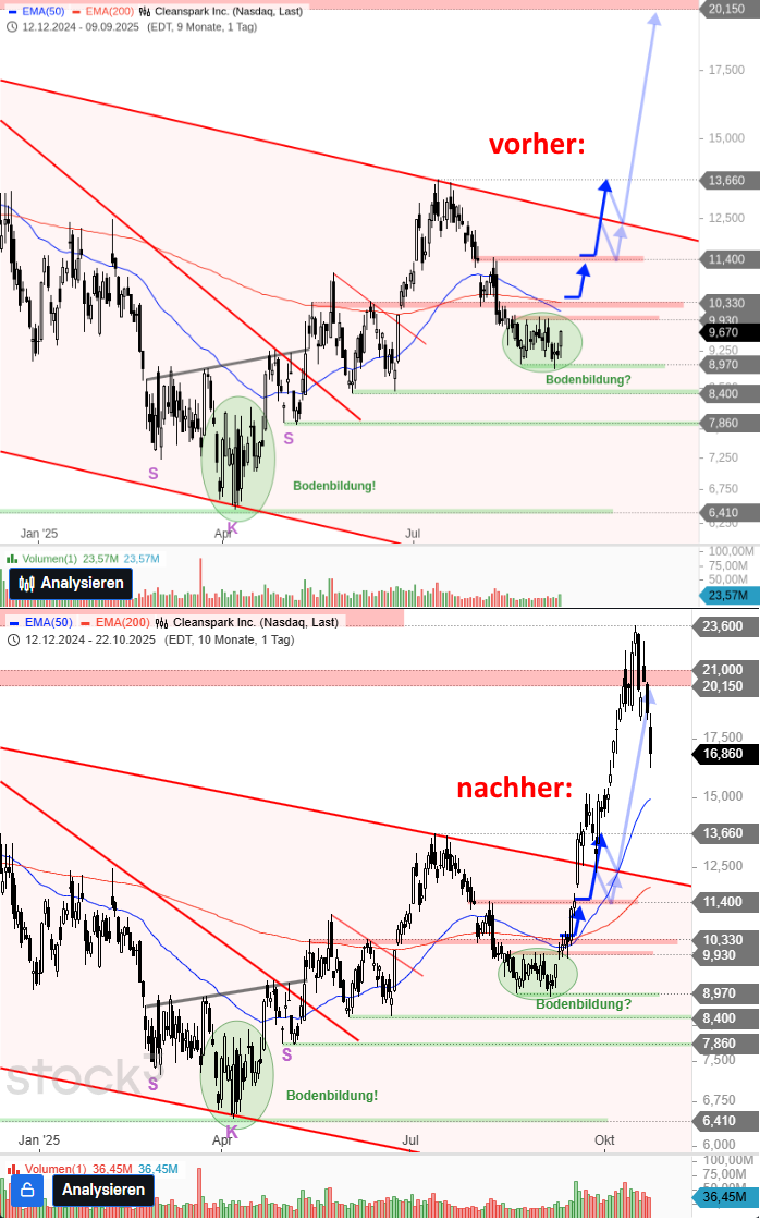 Fazit: Die Cleanspark-Aktie wird ausgehend vom 2024er-Hoch weit abverkauft. Noch könnte es sich dabei um einen normalen Pullback handeln, dem eine Stabilisierung auf hohem Niveau und später weitere Angriffe auf die Hochs aus 2024 und 2025 USD folgen. Der Kursverlauf der vergangenen Wochen zeigt eindrücklich den hochspekulativen Charakter. Das Schicksal der Aktie ist eng verknüpft mit der Kursentwicklung des Bitcoin.