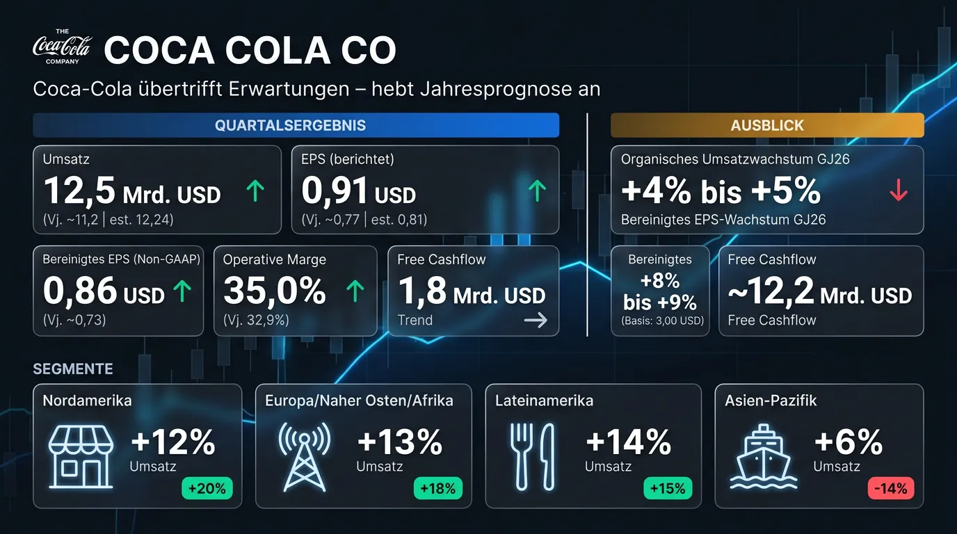Der Getränkekonzern Coca-Cola hat im ersten Quartal 2026 sowohl beim Umsatz als auch beim Gewinn die Analystenerwartungen deutlich übertroffen. Der Nettoumsatz stieg um 12% auf 12,5 Mrd. USD, während das bereinigte Ergebnis je Aktie (EPS) um 18% auf 0,86 USD kletterte – das berichtete EPS erreichte sogar 0,91 USD. Das Absatzvolumen legte weltweit um 3% zu, angeführt von China, den USA und Indien, und das Unternehmen gewann Marktanteile im globalen Nicht-Alkohol-Getränkemarkt. Für das Gesamtjahr 2026 erhöhte Coca-Cola seine Prognose und erwartet nun ein bereinigtes EPS-Wachstum (Non-GAAP) von 8% bis 9% gegenüber 3,00 USD im Vorjahr sowie ein organisches Umsatzwachstum von 4% bis 5%.
