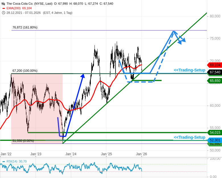 - COCA-COLA-Chart: Der Chartverlauf sagt aus, dass der Kurs 67,5 USD sehr gut zum Kauf aussieht, knapp über der Big Picture Horizontale 67,2 USD. Ein Tief bei 65,5 USD müsste man tolerieren, wäre noch passend, um dann zu 76,87 USD zu kommen.