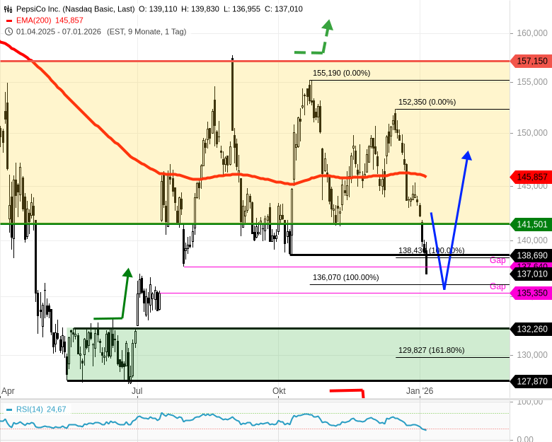 - PEPSI-Chart: Der Chartverlauf sagt aus, dass der Kurs 132,25 USD sehr gut zum Kauf aussieht, knapp über dem "buy trigger" der abgeschlossenen Bodenbildung von 2025.