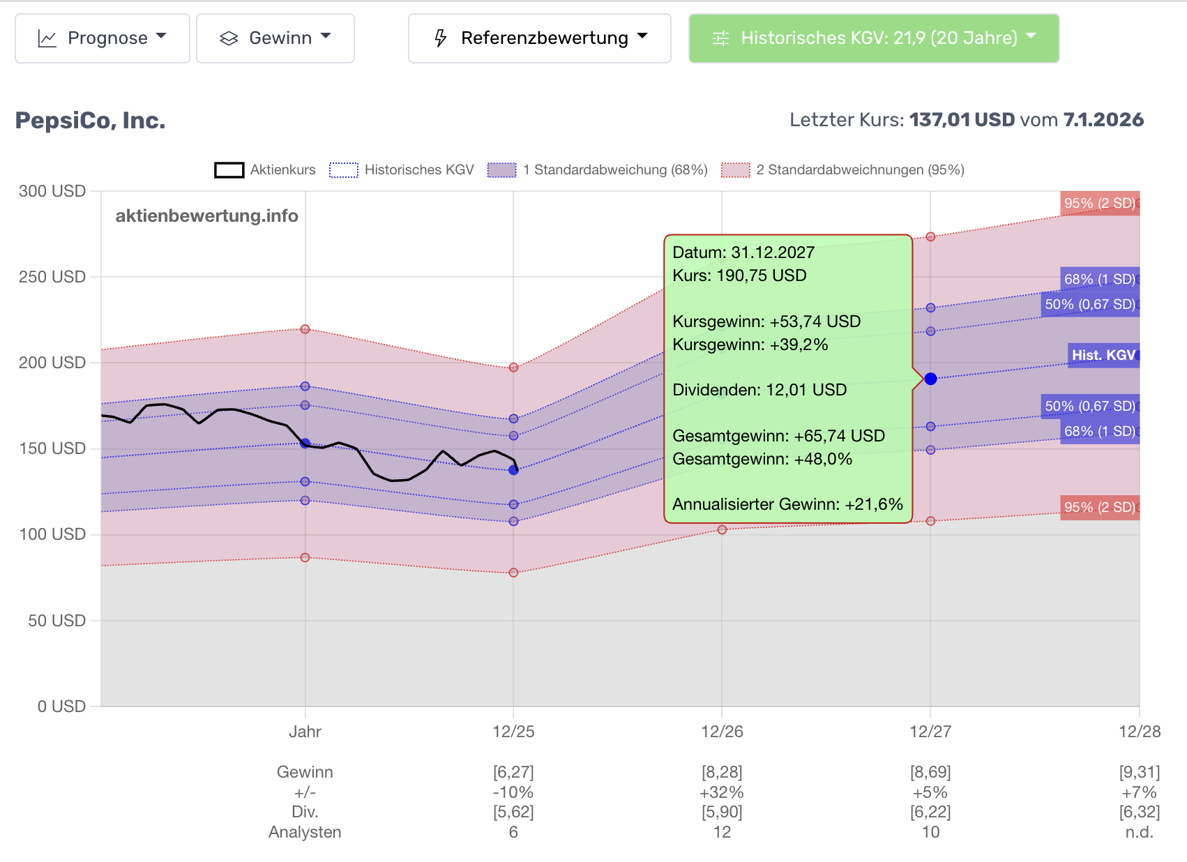 - PEPSI Renditematrix: Bei einem historischen 20-Jahres-KGV von 21,9 dürfen wir am 31.12.2027 einen Aktienkurs von 190,75 USD erwarten, wobei die annualisierte Rendite inklusive der sehr hohen Dividenden +21,6 % wäre (absolut +48,0% bis 31.12.2027).