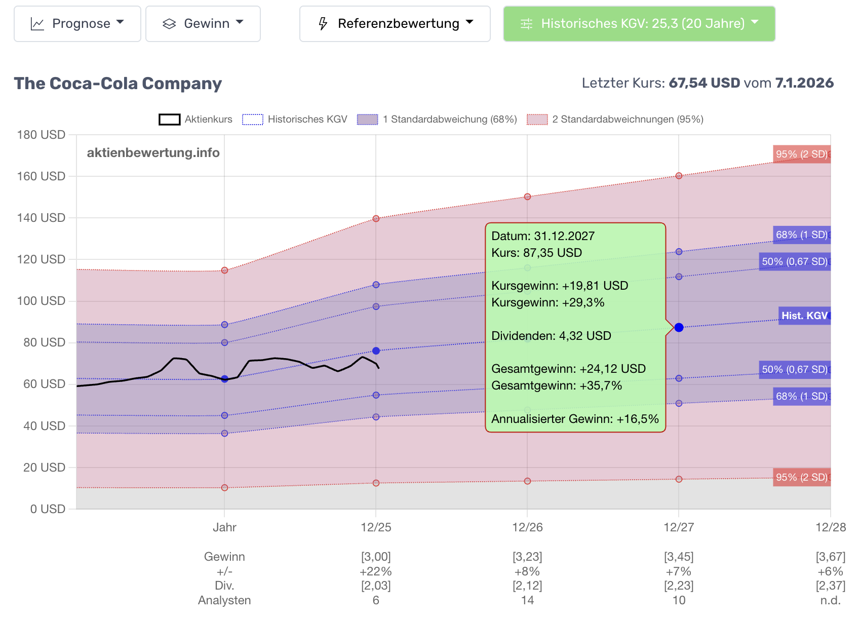 - COCA-COLA-Renditematrix: Bei einem historischen 20-Jahres-KGV von 25,3 dürfen wir am 31.12.2027 einen Aktienkurs von 87,35 USD erwarten, wobei die annualisierte Rendite inklusive der stattlichen Dividenden +16,5% wäre (absolut +35,7% bis 31.12.2027).