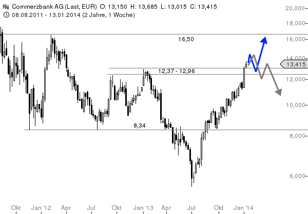 Die 100-Prozent-Marke haben die Aktien von Commerzbank im Zuge der seit Sommer laufenden Rally bereits hinter sich gelassen und damit scheint noch nicht Schluss zu sein. Neben der reinen Performance ist vor allem die Dynamik beeindruckend, mit der die Kurse in den letzten Monaten steigen konnten. Markante Korrekturphasen sucht man innerhalb der Aufwärtsbewegung vergebens und selbst Widerstände wie der Bereich um 12,37 – 12,96 Euro stellten für die Käufer keine Probleme dar. Nachdem nun durch die gestrigen Kursgewinne auch diese Hürde überwunden scheint, könnte es in den nächsten Wochen weiter aufwärts in Richtung 16,50 Euro gehen.