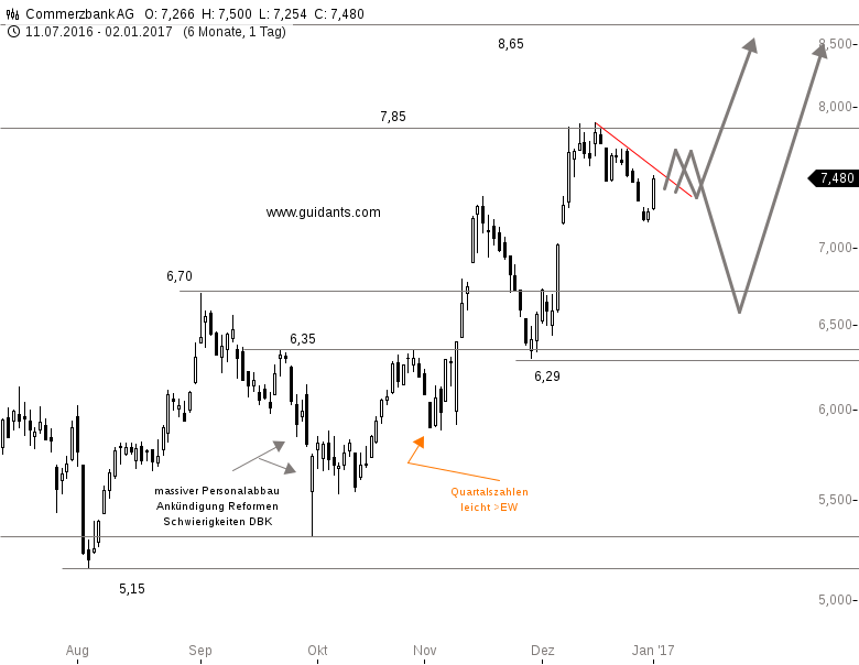 Bliebe es beim aktuellen Kurs von um 7,47 EUR in der Commerzbank-Aktie, hätte diese einen guten Start ins neue Jahr erwischt. Aktuell reicht der Gewinn von über 3 % aus, um die Liste der Gewinner im DAX anzuführen. Dumm ist nur, dass der Handel noch einige Stunden läuft und bekanntlich kann an der Börse viel passieren.