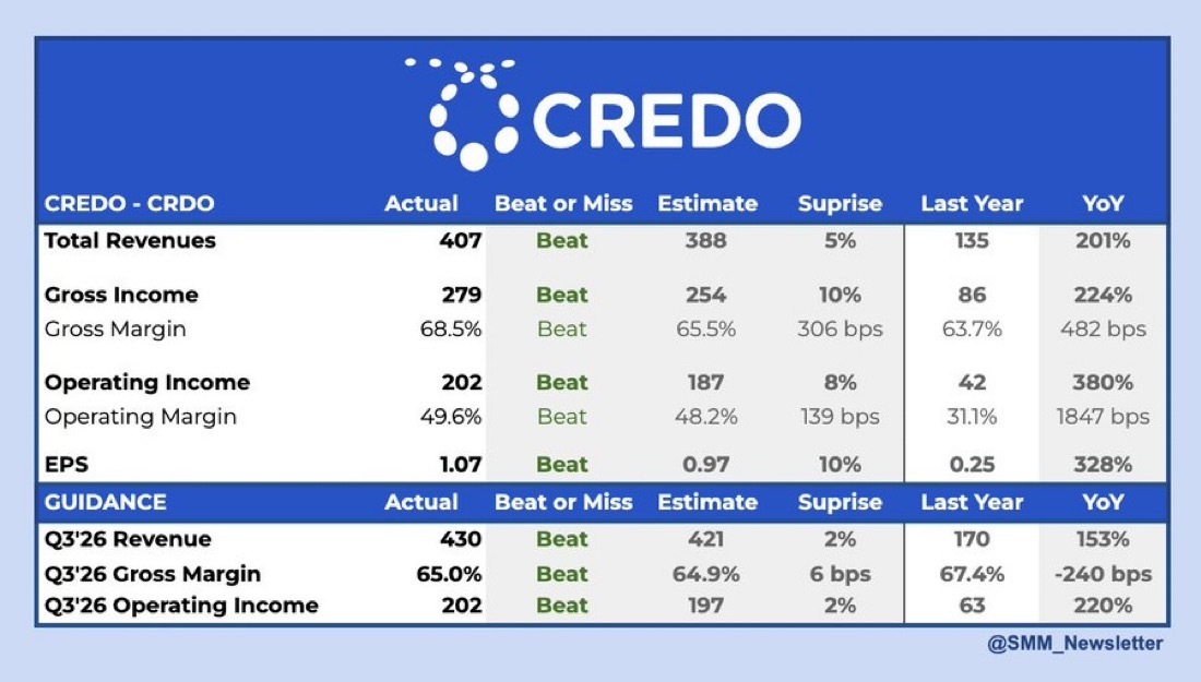 Im Produktnarrativ war die auffälligste Veränderung der vorgezogene Zeitplan bei ZeroFlap Optics. Credo meldete bereits Produktionsauslieferungen an den ersten Neocloud-Kunden und befindet sich nach eigener Aussage bei drei weiteren Kunden in der Qualifikation, darunter Hyperscaler und Neocloud-Betreiber.