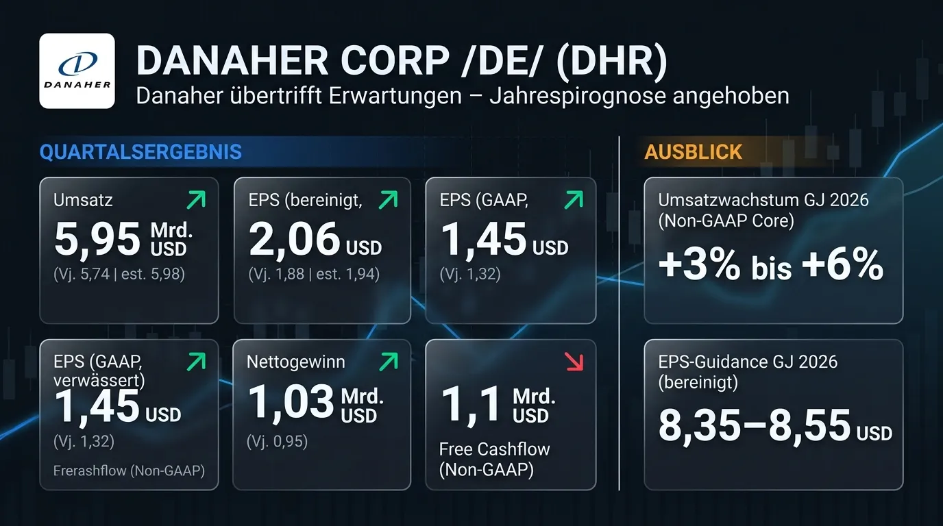 Der US-amerikanische Life-Sciences- und Diagnostikkonzern Danaher hat im ersten Quartal 2026 die Analystenerwartungen übertroffen. Der Umsatz stieg um 3,5 Prozent auf 5,95 Mrd. USD und lag damit knapp unter der Konsensschätzung von 5,98 Mrd. USD, während das bereinigte Ergebnis je Aktie (Non-GAAP) mit 2,06 USD die Analystenschätzung von 1,94 USD deutlich übertraf. Der Nettogewinn kletterte auf 1,03 Mrd. USD (Vorjahr: 954 Mio. USD), getragen von Stärke im Bioprocessing-Bereich und besser als erwarteten Ergebnissen in den Life Sciences. Der operative Cashflow belief sich auf 1,3 Mrd. USD. Für das Gesamtjahr 2026 hob Danaher seine Guidance für das bereinigte verwässerte EPS auf 8,35 bis 8,55 USD an, nachdem zuvor 8,35 bis 8,50 USD prognostiziert worden waren; zudem plant das Unternehmen die Übernahme von Masimo Corporation.