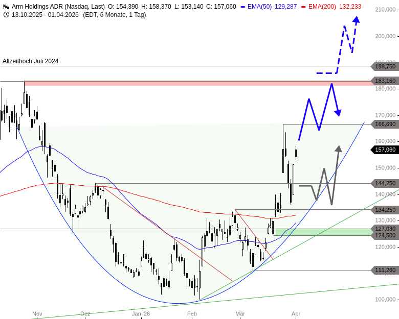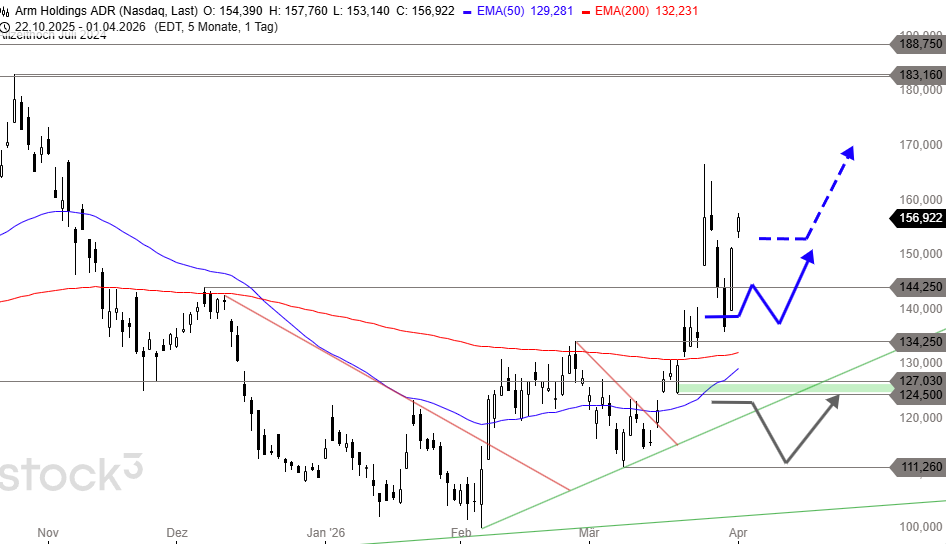 Die Dynamik der bogenförmigen Erholung und des steilen Kaufimpulses seit Mitte März bleibt im System und könnte die Arm-Aktie oberhalb von 166,69 bis 177 USD und darüber an den zentralen Widerstand bei 183,16 USD antreiben. Diese zweifache Barriere dürfte im ersten Anlauf nur schwer zu überwinden sein.