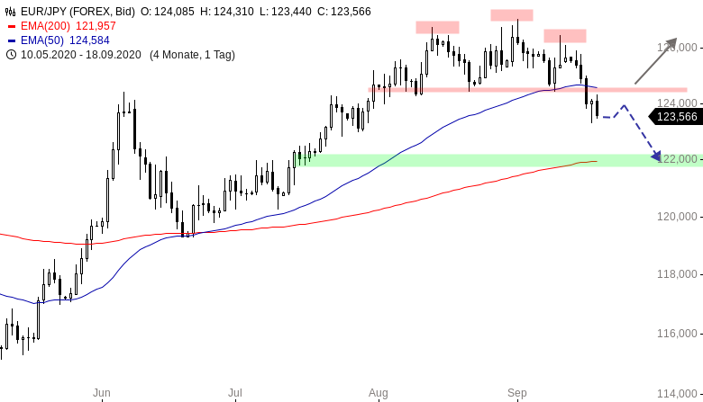 Das Kursziel aus der Schulter-Kopf-Schulter Umkehrformation korrespondiert in etwa mit dem EMA200 im Tageschart. Für die kommenden Tage und Wochen wird daher im EURJPY ein Rücksetzer in den Bereich 121,80 bis bis 122,00 JPY favorisiert.