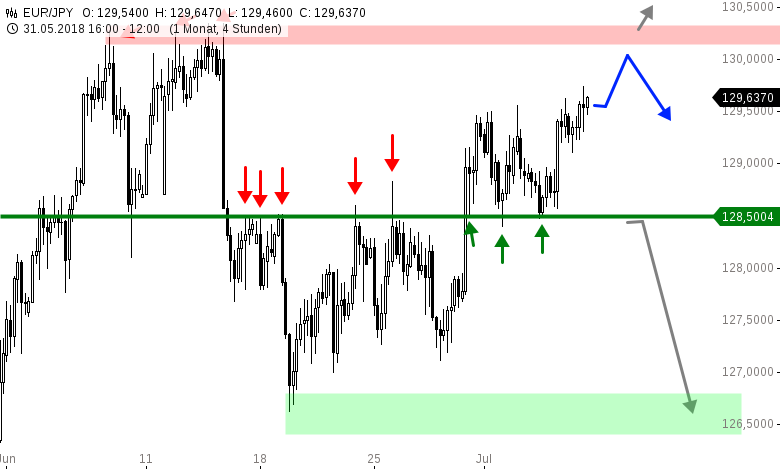 Ein lehrbuchreifes Beispiel zum Thema Widerstand und Unterstützung bot in den vergangenen beiden Wochen der 4-Stundenchart des Euro gegenüber dem japanischen Yen: Nach dem Kursrutsch vom 14. Juni fungierte der Bereich um 128,50 JPY in der zweiten Junihälfte als entscheidender Horizontalwiderstand auf der Oberseite. Insgesamt 5 mal bissen sich die Bullen an diesem Level die Zähne aus.