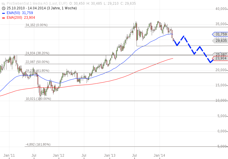 Werfen wir zunächst einen Blick auf das Chartbild der ProSiebenSat1. Kursverlauf seit 2011 im Wochenchartintervall (1 Kerze = 1 Woche). Mitte 2013 erreichte die Aktie das finale Projektionsziel bei 24 Euro. Seitdem läuft eine große Seitwärtskorrektur. Es handelt sich um ein Doppeltop der Adam & Eve Variante. Das erste Top entsteht impulsiv als V-Top, das zweite Top als Rounding Top. Wenn sie die Nackenlinie bei 27,80 Euro nicht verteidigen können, wird es gefährlich. Korrekturziele liegen bei 25,00 und 22,00 Euro.