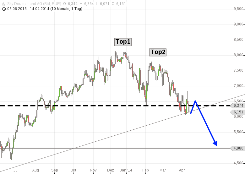 Die Aktie von Sky Deutschland imponiert seit September vergangenen Jahres mit einem Doppeltop. Das Papier ist seit 3 Wochen dabei, mit einer pseudo-bullischen Flagge durch die Nackenlinie bei 6,4 euro hindurch zu rutschen. Das Korrekturziel liegt im 5,00 Eurobereich.