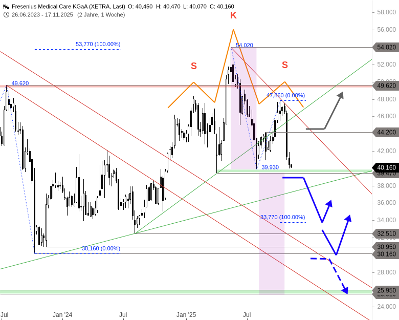 Mit den beiden das Hoch vom Mai einrahmenden Tops aus dem Januar und Oktober bildet sich eine große mehrmonatige SKS-Formation bei der Aktie von Fresenius Medical Care. Dieses bärische Trendwendemuster ist bei einem Bruch der Unterstützung bei 39,47 EUR aktiviert.