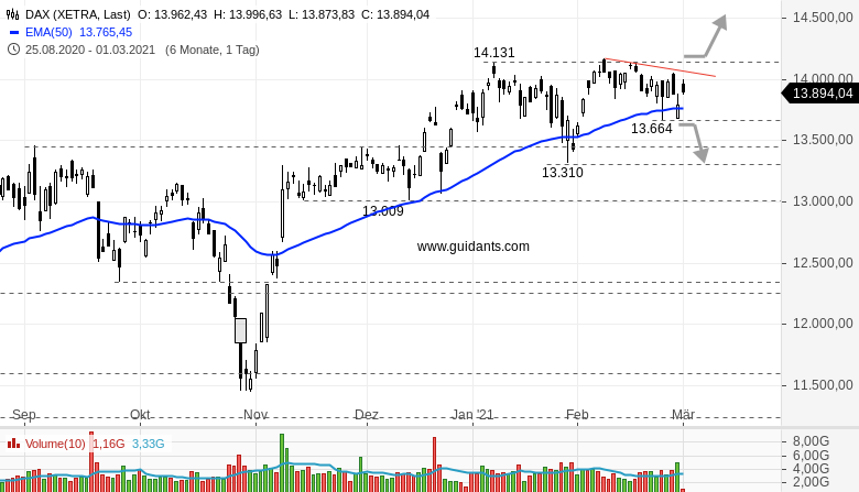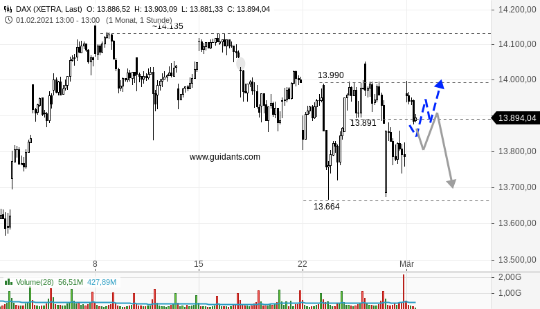 Der Deutsche Aktienindex startete heute mit einem kräftigen Aufwärtsgap in den Tag und attackierte damit den Widerstandsbereich bei 13.990/14.000 Punkten. Wie aber schon in der letzten Woche, war auch dieses Mal der dortige Widerstandsbereich zu stark. Der Dax prallte nach unten hin ab und machte sich bis zum Mittag daran, sein Aufwärtsgap zumindest ansatzweise zu schließen. Dabei wurde nun der Support bei 13.890 Punkten erreicht. Gelingt ihr ein bullisches Comeback?