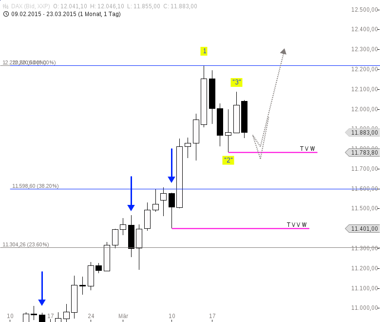 Im Tageschart haben wir in der letzten Woche nur einen ersten Rücksetzer gesehen. Am Freitag wurde nochmal die Bewegung nach oben aufgenommen ohne direkt ein neues Allzeithoch auszubilden. Bis jetzt fällt der DAX nach unten und befindet sich damit wieder leicht in der Korrektur. Ein 1-2-3 Hoch würde im Tageschart erst aktiviert werden, wenn der DAX unter das Tief vom letzten Donnerstag fällt. Solange dieses nicht per Tagesschlusskurs passiert bleiben die Zahlen in Anführungsstriche stehen. Mit grau skizziert, falls der DAX vor Erreichen der 11.783 Punkte oder ohne Schlusskurs unter der Marke wieder nach oben abdreht.